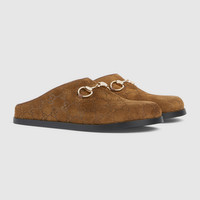 The House continues to feature archival symbols in the signature mule. The Horsebit hardware in light gold-toned finish elevates this style, crafted in GG suede for effortless elegance. - Brown GG suede - Light gold-toned hardware - Leather lining - Horsebit - Round toe - Rubber sole - Flat