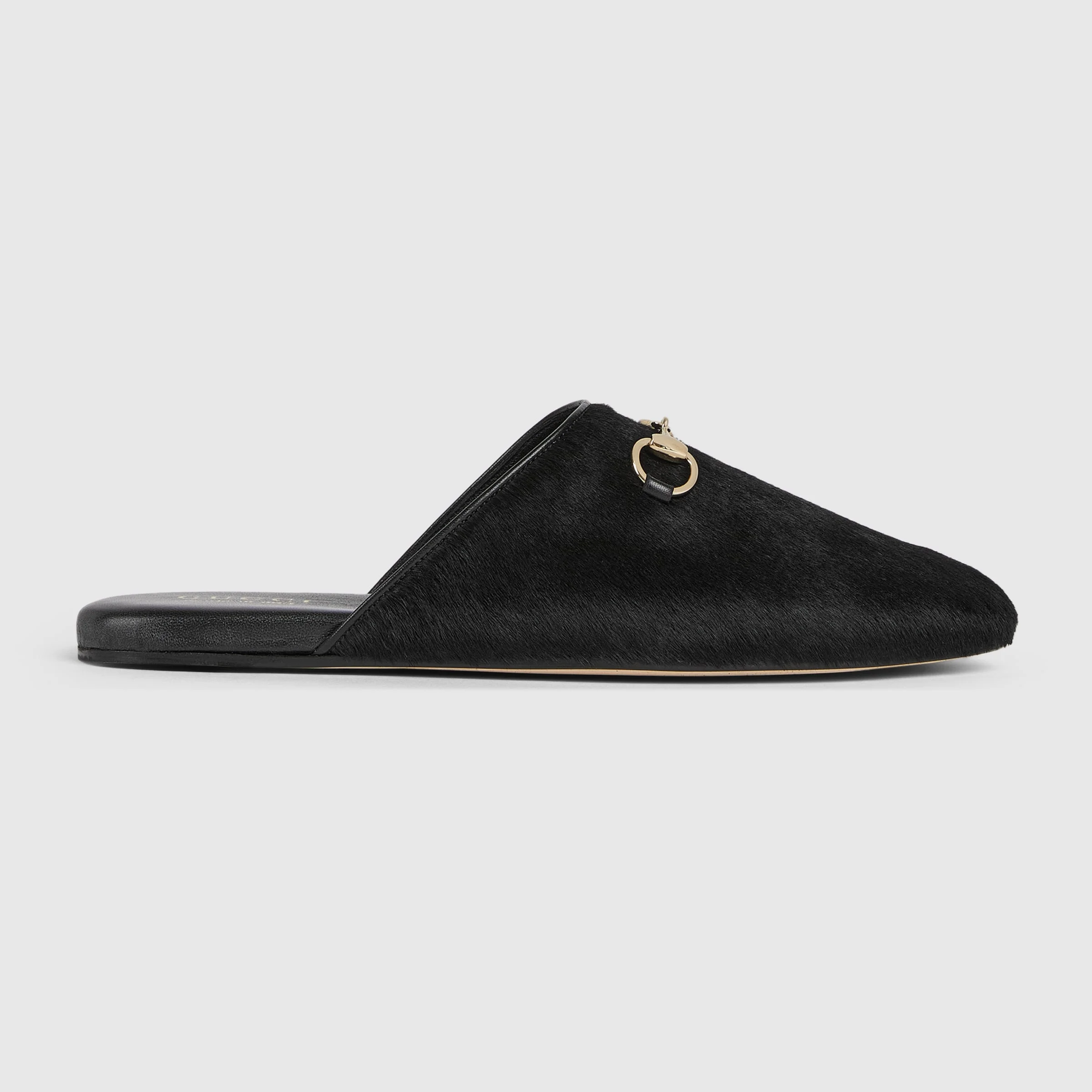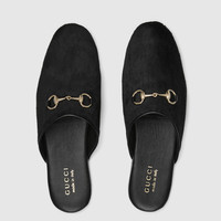 In the Fall Winter 2025 collection, Gucci continues to feature archival symbols. For the latest collection, the Horsebit hardware recalls the House's equestrian heritage. This pair of women's mule is crafted in smooth suede and defined by a light gold-toned hardware. - Black suede - Light gold-toned hardware - Horsebit - Leather sole - Flat - Made in Italy