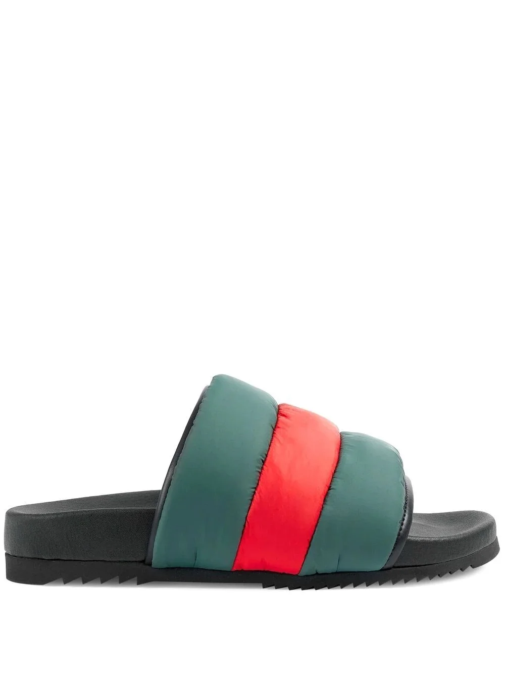 Recalling outerwear, this pair of slide sandals is a new interpretation of padded nylon. The oversize material stands out in green and red, the colors of the House Web. - Green and red Web padded nylon - Women's - Black details in Demetra—crafted from animal-free raw materials that are primarily from sustainable, renewable, and bio-based sources - Rubber sole - Flat - Made in Italy