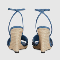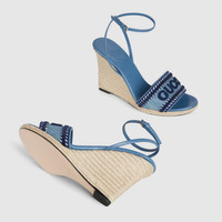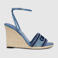The espadrille has been reinterpreted for Cruise 2025 in light blue denim. The shoe is complete with 'Gucci' embroidery and a cord-covered wedge. - Light blue denim - Women's - Leather lining - 'Gucci' embroidery - Cord covered wedge - High heel - Made in Spain