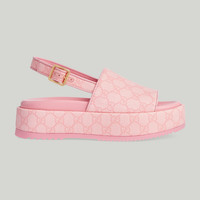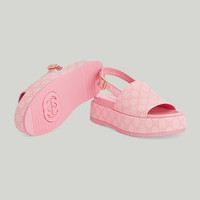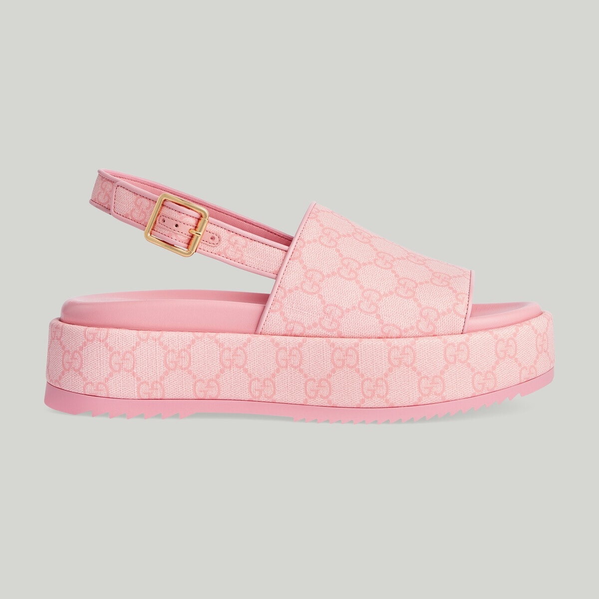 A recognizable shape reintroduced for the latest collection, this chunky platform sandal is imagined in white Supreme canvas with a monogram trim at the outer sole. Inspired by a '30s motif, the GG has appeared in countless iterations, often adding a retro logo element. - Pink GG Supreme canvas - Women's - Pink GG Supreme platform - Rubber sole - Adjustable ankle strap closure - Low-heel - 1.4" height, based on a size 37(IT) - Made in Italy