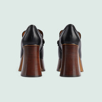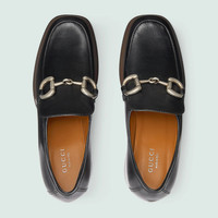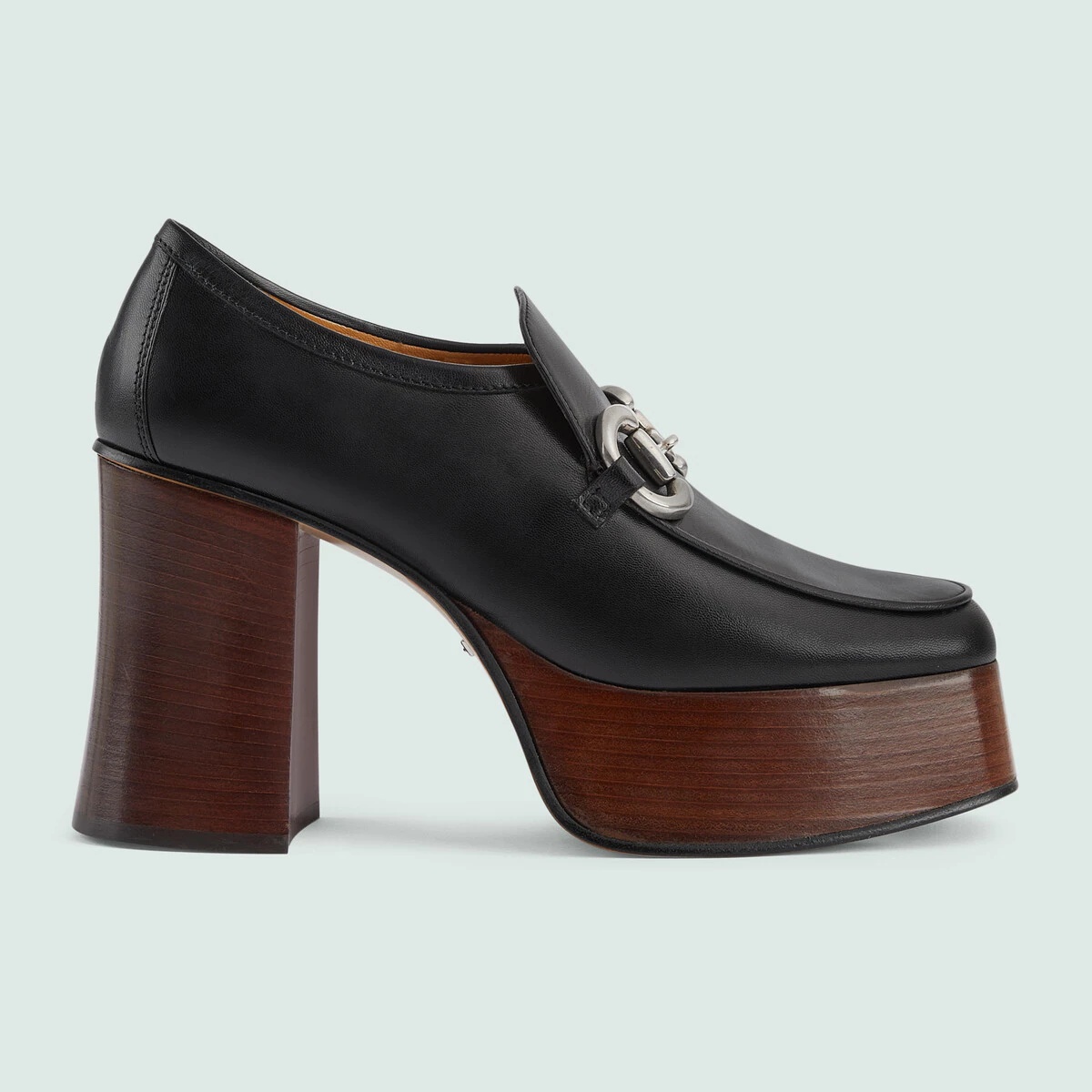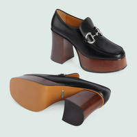 A tribute to the House's equestrian roots, the Horsebit is reinterpreted each season. Here, the archival symbol takes on a contemporary feel when paired with this loafer's flared heel. - Black leather - Women's - Palladium-toned hardware - Horsebit - Block flared heel - Leather sole - High heel - 3.8" heel height with 1.6" platform - Made in Italy