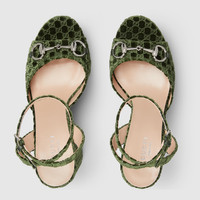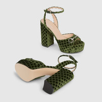 Elevated yet effortless, this women’s platform sandal pairs luxurious GG velvet with the signature Horsebit detail and merges heritage elegance with a bold, contemporary silhouette. - Black GG velvet - Silver-toned hardware - Horsebit - Leather sole - Adjustable ankle closure with buckle - High heel - Height: 4.5" - Made in Italy