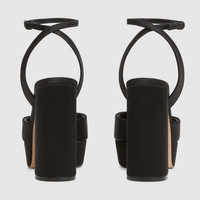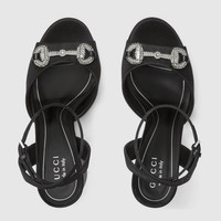 The signature Horsebit defines this pair of elegant satin sandals with a sparkling crystal finish. A platform high heel and the adjustable buckle closure complete the style. - Black satin - Silver-toned hardware - Leather lining - Crystal Horsebit - Adjustable ankle closure with buckle - High heel