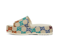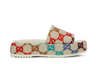 First used in the 1970s, the GG logo was an evolution of the original Gucci rhombi design from the 1930s, and from then it's been an established symbol of the House's heritage. Here, the pattern defines this pair of platform slide sandal in vibrant colors. Deepening the connection to the brands' heritage, Guccio Gucci's initials also appear as a raised motif at the sole. - Multicolor GG linen fabric - Women's - Platform sole with rubber bottom - Mid-heel - 2.2" height - Made in Italy
