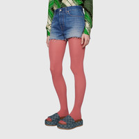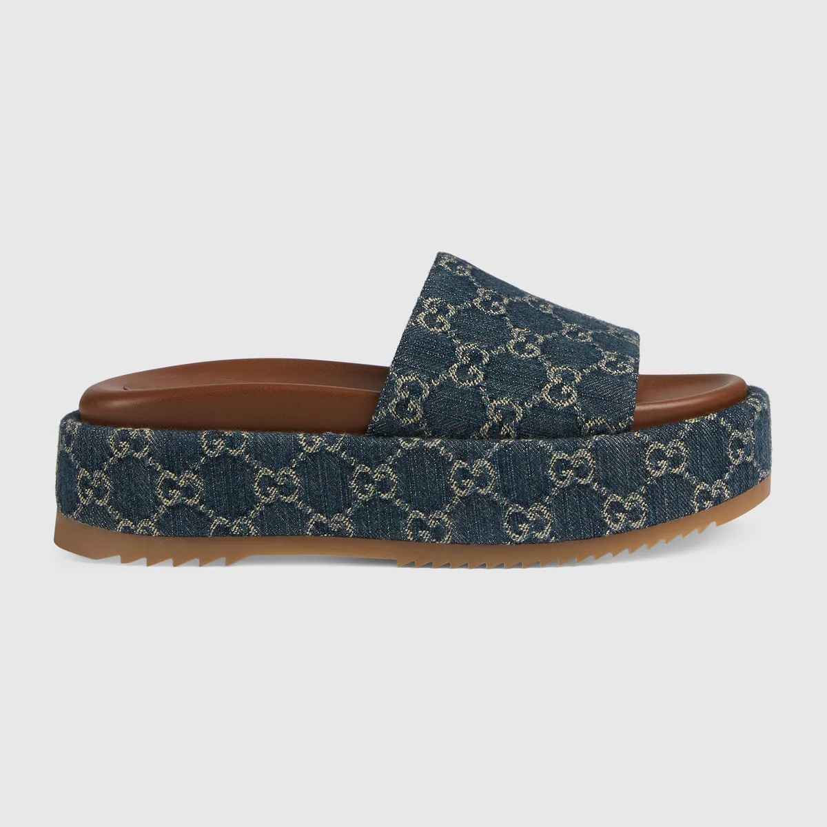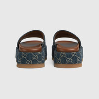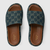 A defined platform sole adds a '90s twist to the slide sandal. Crafted from an oraganic denim jacquard, the allover GG motif references the decade's logo trend, deepening the retro feel. - Dark blue and ivory eco washed organic GG jacquard denim - Women's - Platform sole with rubber bottom - Mid-heel - 2.2" height - Made in Italy