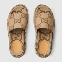 Instantly recognizable emblems of the brand, logos enrich designs in new and unexpected ways. Behind every logo lies the tradition and value of the House, an everlasting medium one can wear again and again. Following the idea of constant change and experimentation, different iterations of the logo have been presented each collection. The maxi GG, a new version of the historic monogram, defines this pair of slide sandals. - Camel and ebony maxi GG canvas with GG canvas trim - Women's - Platform sole with rubber bottom - Mid-heel - 2.2" height - Made in Italy