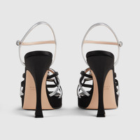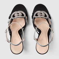 The latest women's shoes collection presents evening silhouettes with a crystal-set Interlocking G hardware, adding a sparkling touch to this pump. - Black suede and metallic silver-toned leather - Leather lining - Crystal Interlocking G - Softly square vamp - Leather sole - Spool high heel - Height: 4.7"; with 0.6"platform