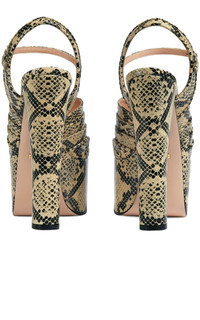 Beige and black platform sandals from Gucci. Crafted from leather with a python skin effect, this model features an ankle strap fastening and a beige leather sole. Buckle fastening Platform sole Snake print Stiched geometric motif Composition: Leather 100% Lining: Leather 100% Sole: Leather 100% Platform Height: 6cm Heel Height: 15.5cm Made in Italy.