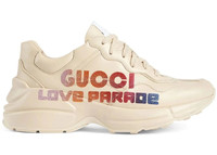 Paying homage to the city that created a fascination with the movie industry, Gucci Love Parade is a collection inspired by Hollywood's glamour and pop culture—mixing old Hollywood with the new. This pair of Rhyton sneakers depicts the print 'Gucci Love Parade Los Angeles' with stars. The layering of different styles shows the eclectic nature of the House, where the past seamlessly blends with the present. - Ivory leather - Women's - Glitter 'Gucci Love Parade' - LOVEPARADE word marks and related logos © Love Parade Berlin GmbHde' print - Glitter heart sun - Rubber sole - Lace-up closure - Low heel - Made in Italy