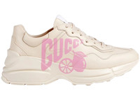 Part of the Gucci references to pop culture, fruits in all shapes and forms continues to enrich the House's narrative. For Gucci Aria, they appear as playful prints, often enriching a selection of ready-to-wear and accessories. This pair of Rhyton sneakers is defined by the 'Lemon Gucci' print. - Ivory leather - Women's - 'Lemon Gucci' print with 'Gucci' on one shoe and 'Lemon' on the other - Gucci logo tag - Low heel - 1.8" height - Made in Italy