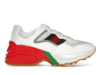 With its recognizable oversized sole and chunky construction, the Rhyton is introduced in leather effect fabric in contrasting colors. A message about leaving fashion’s old rules behind, the Epilogue collection conveys the idea that pieces should be timeless–not just in fashion for one season. Speaking to this theme, signature House styles are reimagined in new ways. - White leather effect fabric, white mesh and gray reflective fabric - Women's - Green and red Web - Lining contains leather made through an innovative scrap-less process that minimizes the production of finished leather scraps and decreases the consumption of new natural resources compared to traditional methods. Laces contains organic cotton where the cultivation and manufacturing process restrict the use of chemicals, eliminate pesticides or artificial fertilizers and incorporate methods that respect biodiversity, improve soil quality, and reduce water consumption. - Rubber sole - Gucci logo tag - 1.8" height - Made in Italy