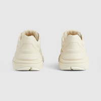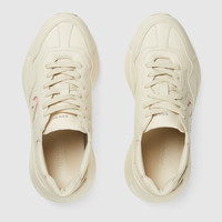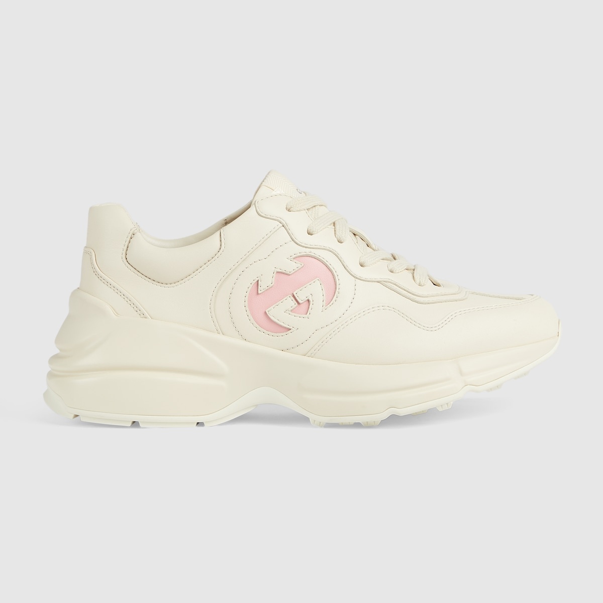 Designs inspired by the sporting world are interpreted through the Gucci lens with standout logo details. This pair of ivory leather Rhyton sneakers is defined by a bold Interlocking G cut-out in a contrasting hue, presenting a new take on the House logo. - Ivory leather - Women's - Pink trim - Contrasting Interlocking G cut-out - Rubber sole - Additional pair of laces included - Lace-up closure - Mid-heel - 2.8" height - Made in Italy
