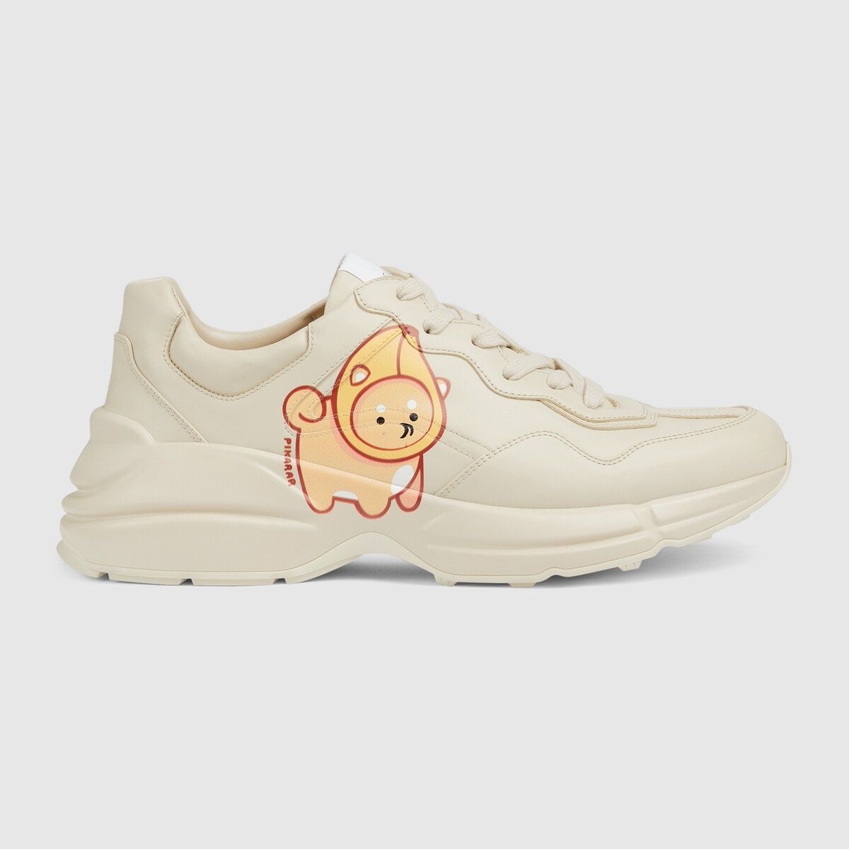 The artwork by America-based illustrator and designer, Angela Nguyen, also known as 'Pikarar', adds a playful touch to ready-to-wear pieces and accessories with vibrant prints or embroideries inspired by pop culture, anime, and animals. Here this Rhyton sneaker is defined by an animal print. - Ivory leather with animal print - Women's - Artwork by Angela Nguyen 'Pikarar' - Gucci logo tag - Rubber sole - Additional pair of laces included - Lace-up - Low heel - Made in Italy