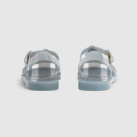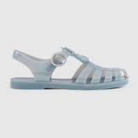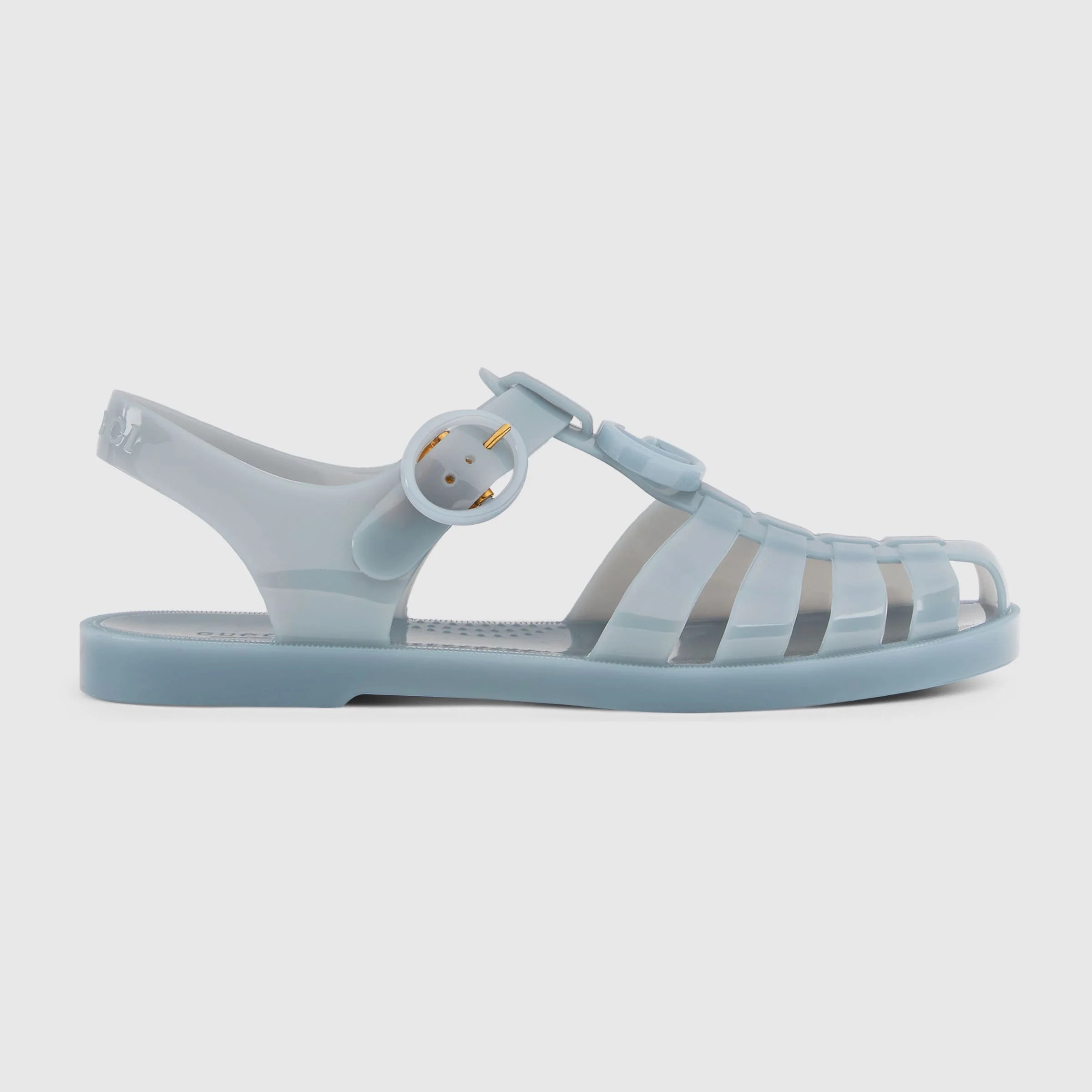 Sandals are an essential warm weather style. This whimsical and effortless design is further elevated with a tonal Double G hardware. - Light blue rubber - Gold-toned hardware - Tonal Double G - Gucci logo detail on the back of the strap - Rubber sole - Adjustable ankle strap with buckle closure - Flat - Height: 0.4"