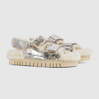 Lending a contemporary and sporty touch, these flat sandals with velcro straps offer all-day ease. Elevated with uniquely textured leather and merino wool lining, the style is defined by a delicate Double G hardware. - Metallic silver textured leather - Silver-toned hardware - Merino wool lining - Double G - Rubber lug sole - Adjustable ankle closure with buckle - Made in Italy
