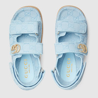 Gucci's contemporary narrative explores a unique blend of traditional elements and the much-loved symbols of the House. This pair of sandals is defined by the beloved Double G hardware, adding a subtle logo feel, mixed with the versatility of the Velcro straps. - Light blue GG canvas - Women's - Light gold-toned hardware - Leather lining - Double G - Rubber sole - Velcro strap closure - Flat - Made in Italy