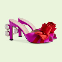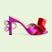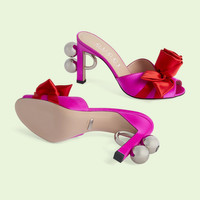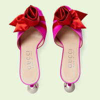 Taking inspiration from the world of jewelry, this pair of open-toe sandals are defined by a silver-toned sphere detail at the heel. The detail appears throughout the world of Gucci Love Parade, adding an unexpected yet sensual note to designs. This pair of shoes is further elevated by a handmade rose detail that channels the intricate craftmanship behind each piece of the collection. - Pink satin - Women's - Interlocking G sphere detail on heel - Satin rose detail - Open toe - High-heel - 3.7" heel height - Made in Italy