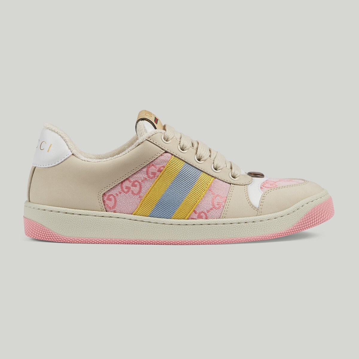 Influenced by classic trainers from the '70s, the Screener sneakers—named for the defensive sports move—feature the Web stripe on the side and vintage Gucci logo. Here the emblematic style is presented in light pink GG canvas and defined by a beige suede trim. - Light pink GG canvas - Women's - Beige suede trim - Yellow and blue Web - White leather details - Oval enameled detail with metal Double G - Label with Gucci vintage logo - Bi-color rubber sole - Additional pair of laces included - Flat - 1.4" height - Made in Italy