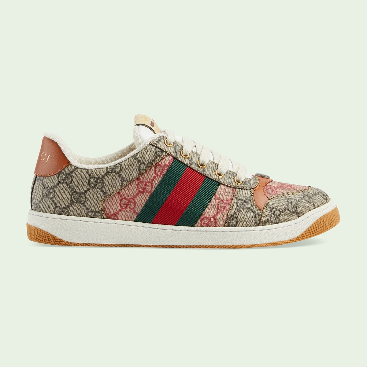 In celebration of the Year of the Rabbit, as well as the arrival of Spring, the House presents a wide-ranging selection of colorful pieces featuring various renditions of the wistful creature, as well as styles in various combinations of materials alongside the Gucci logo. Animal motifs often feature in Gucci collections, sometimes accompanied by signature emblems or floral patterns as an expression of the House's fascination with the beauty of the natural world. - Beige and ebony GG Supreme canvas and beige and hibiscus red GG Supreme canvas - Green and red Web - Brown leather details - Women's - Oval enameled detail with metal Double G - Bi-color sole - Additional pair of laces included - Low heel - 1.3" height - Made in Italy