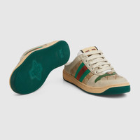 Influenced by classic sneakers from the 1970s, the Screener sneakers is named for the defensive sports move. This mule variation appears in beige leather. The green and red Web stripe on the side and the vintage Gucci logo complete the style. - Beige leather - GG canvas trim - Green and red Web - Oval enameled detail with metal Double G - Label with Gucci vintage logo - Bi-color flatform sole - Additional pair of laces included - Low heel - 1.9" heel height - Made in Italy