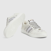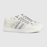 Influenced by classic trainers from the '70s, the Screener sneakers—named for the defensive sports move—feature the Web stripe on the side and the vintage Gucci logo. Here the style is reimagined in grey leather and white GG Crystal canvas, while a grey and white glittery Web completes the style. - Light grey leather - Women's - White GG Crystal canvas insert - Grey and white Web - Oval enameled detail with metal Double G - Label with Gucci vintage logo - Bi-color sole - Low heel - 1.3" height - Made in Italy