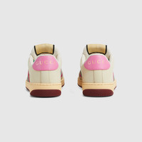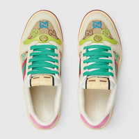 Influenced by classic sneakers from the 1970s, the Screener sneaker is named for the defensive sports move. Here the emblematic style is presented in a multicolored canvas with colorful GG embroidery and a pink and green stripe that recalls the Web. - Multicolored canvas - Allover GG embroidery - Pink and green stripe - Pink and white leather details - Leather lining - Oval enameled detail with metal Double G - Label with Gucci vintage logo - Bi-color rubber sole - Additional pair of laces included - Lace-up closure - Low heel