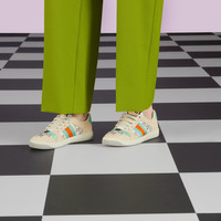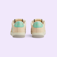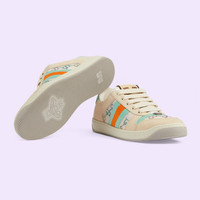 Influenced by classic trainers from the '70s, the Screener sneakers—named for the defensive sports move—feature the Web stripe on the side and the vintage Gucci logo. Here the style is reimagined in crystal defined GG fabric, with vintage green leather details. - Beige fabric with multicolor GG crystals - Women's - Green and orange vintage Web - Green leather details - Oval enameled detail with metal Double G - Label with Gucci vintage logo - Bi-color sole - Low heel - 1.3" height - Made in Italy