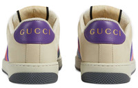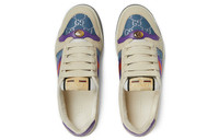 Presented in an iteration of a archival-inspired fabric, the Screener is designed in a mix of ivory leather and blue and silver light GG lamé. Influenced by classic trainers from the '70s, the sneaker—named for the defensive sports move—features the Web stripe on the side and vintage Gucci logo. - Ivory scrap less leather with blue and silver light GG lamé - Women's - Purple and red Web - Purple scrap less leather details - This product contains leather made through an innovative Scrap-less process that minimizes the production of finished leather scraps and decreases the consumption of new natural resources compared to traditional methods. We further reduce our environmental impact by tanning only the leather actually needed for production. - Oval enameled detail with metal Double G - Label with Gucci vintage logo - Bi-color sole - Rubber sole - Low heel - 1.2" height - Made in Italy
