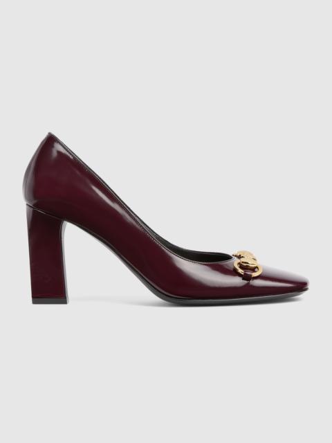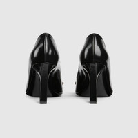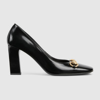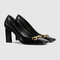 Introducing Spring Summer 2026. Inspired by the Italian word for "Mrs.", Signora reimagines the House's heritage pump through a sleek square toe and chunky heel with slim profile, adding a contemporary touch to the refined glamour of the La Famiglia collection. - Black soft shiny leather - Gold-toned hardware - Black leather lining - Horsebit and "Made in Italy by Gucci" logo in matching metallic finish - Sleek square toe - Leather sole - Chunky heel with a slim profile - Mid heel - Height: 3.3" - Made in Italy