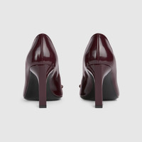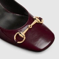 Introducing Spring Summer 2026. Inspired by the Italian word for "Mrs.", Signora reimagines the House's heritage pump through a sleek square toe and chunky heel with slim profile, adding a contemporary touch to the refined glamour of the La Famiglia collection. - Dak burgundy soft shiny leather - Gold-toned hardware - Black leather lining - Horsebit and "Made in Italy by Gucci" logo in matching metallic finish - Sleek square toe - Leather sole - Chunky heel with a slim profile - Mid heel - Height: 3.3" - Made in Italy