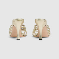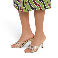 The latest women's shoes collection presents evening silhouettes with a crystal-set Interlocking G hardware, adding a sparkling touch to this slide sandal. - Silver metallic leather - Leather lining - Crystal Interlocking G - Softly square vamp - Leather sole - Spool heel - Mid heel - Height: 3.3"