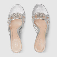 The latest women's shoes collection presents evening silhouettes with a crystal-set Interlocking G hardware, adding a sparkling touch to this strappy slide with a spool heel. - Metallic silver leather with crystals - Leather lining - Crystal Interlocking G - Softly square vamp - Height: 3.3" - Made in Italy