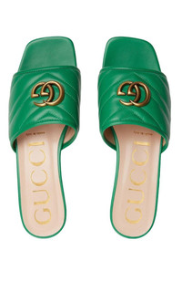 Recalling precious gems and stones, vibrant jewel tones appear throughout the Ouverture collection. Here, the women's slide sandal is crafted from emerald green matelassé leather with a chevron motif and completed by the emblematic Double G hardware—a symbol from the '70s archives. - Emerald green matelassé chevron leather - Women's - Gold-toned hardware - Double G - Leather sole - .6" heel height - Made in Italy