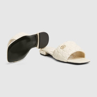 Crafted from the refined GG leather, this statement piece combines heritage-inspired design with contemporary elegance. Featuring the signature Double G hardware, the sandal exudes timeless charm and brand prestige. - Ivory GG leather - Women's - Light gold-toned hardware - Leather lining - Double G - Flat - Height: 0.5" - Made in Italy