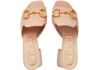 With a strong retro note, this leather slide sandal is defined by a square-toe and subtle block heel. The emblematic gold-toned Horsebit hardware completes the shoe, enhancing the style's symbolic connection to the House. - Pink leather - Women's - Gold-toned hardware - Horsebit - Metal detail at heel - Leather sole - Mid-heel - 3" heel height - Made in Italy