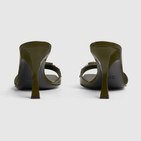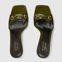 Crafted from dark green shiny leather, this women's slide sandal combines elegance and modernity in a supple, refined design. The light gold-toned Horsebit defines the design, adding a subtle yet unique touch to it. - Dark green shiny leather - Light gold-toned hardware - Horsebit - Leather sole - Mid-heel - Height: 3.3"