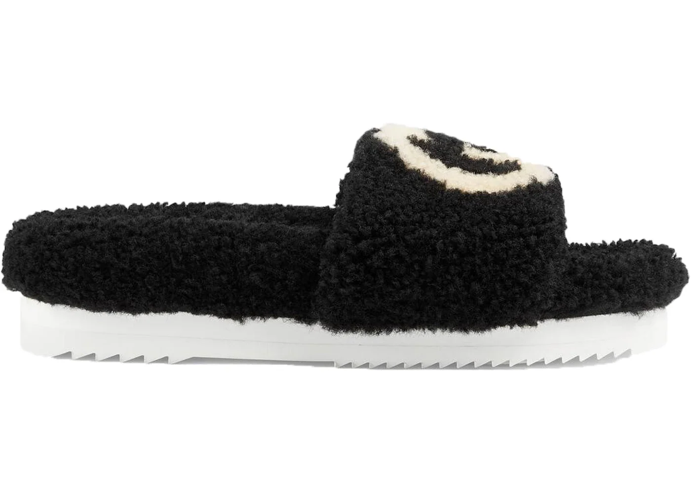 Hybrid designs enrich the Gucci narrative by bringing together surprising materials and styles. Playing with expectations, this pair of slide sandals is crafted from black merino wool in a design that recalls house slippers. The House's monogram adds a logo feel. - Black Interlocking G merino wool - Women's - Flat - Made in Italy