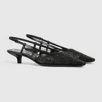 This pair of slingback shoes are presented in black mesh with a sparkling GG motif, presenting a new idea of femininity that shows glamorous details, such as lace, crystals and sheer fabrics. - Black mesh with GG crystals - Leather lining - Leather sole - Back buckle closure - Low heel - 1.4" heel height - Made in Italy