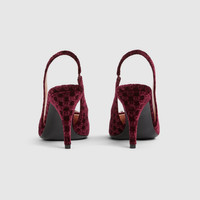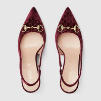 Crafted from smooth GG velvet, this women's pump is defined by a sleek pointed toe and a Horsebit detail—an homage to Gucci's equestrian heritage. The polished finish and iconic hardware reimagine a classic silhouette through a contemporary lens, - Bordeaux GG velvet - Light gold-toned hardware - Horsebit - Leather sole - Adjustable ankle closure with buckle - Mid-heel - Height: 3.3" - Made in Italy
