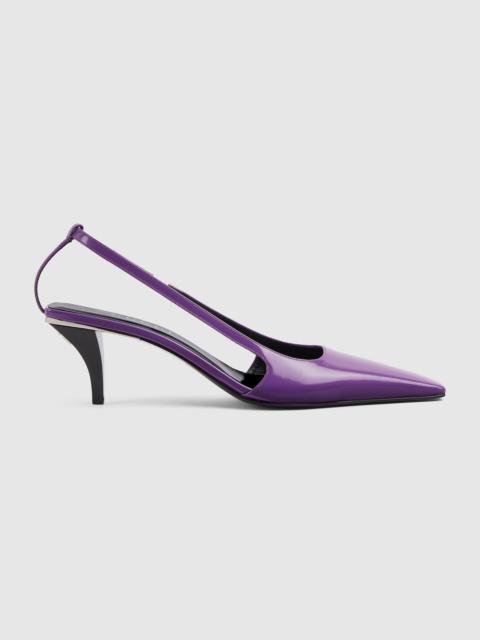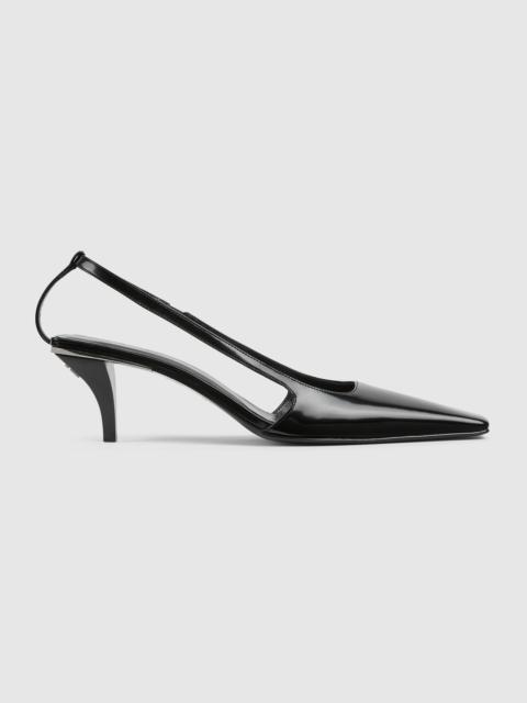 Introduced on the Cruise 2026 runway, this slingback exudes 1990s opulence with an elongated, square silhouette. The style, drawing from archival inspirations, is complete with a crystal logo, intricately set on a metal plate behind the right heel. - Black shiny leather - Leather lining - Metal plate with crystal logo on the back of the right heel - Elongated square toe - Square vamp - Leather sole - Kitten mid-heel - 2.2" height