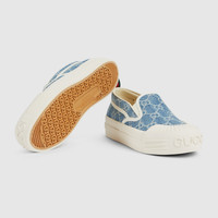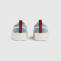 This slip-on sneaker is defined by a minimalist silhouette, enriched with a Gucci logo and signature Web tag. A contemporary essential that nods to the House’s heritage. - Light blue GG denim - Web puller tag - Gucci logo - Rubber sole - Flat - Height: 0.1" - Made in Spain