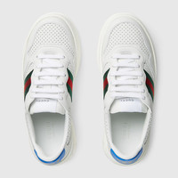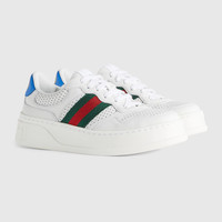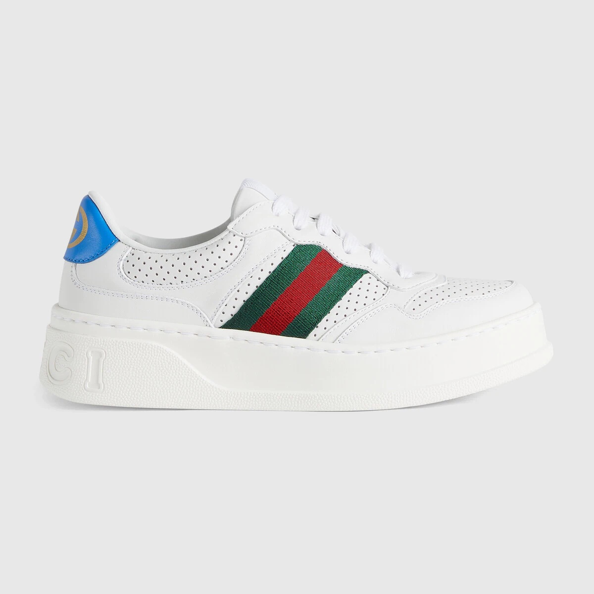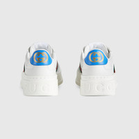 The House Web celebrates Gucci's origins in the equestrian world. Each season it evolves, taking on new shapes and interpretations. Playing with the theme of sports and leisure, the blue and red detail defines this pair of leather sneakers. The shoe's chunky silhouette adds a retro feel to the design. - White leather with blue detail at back - Women's - Green and red Web - Leather sole - Additional pair of laces included - Lace-up closure - Flat - Made in Italy