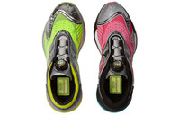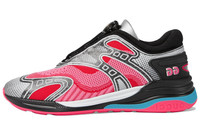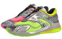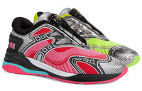 Debuting in the Spring Summer 2020 collection, the evolution of the Ultrapace sneaker is presented in a mismatched pair in neon pink and yellow. Crafted from a knit fabric, the contrasting color combination speaks to the celebration of self-expression that runs throughout the collection. The style is completed by a reflective trim and a futuristic closure mechanism. Instead of laces, the shoes can be opened and closed by twisting a wire-dial closure featuring the Interlocking G logo. - One shoe in yellow knit fabric, the other in pink - Reflective trim - Rubber Double G - Gucci logo print - Rubber sole with contrast stripe - Wire dial closure with Interlocking G - 1.2" height - Made in Italy