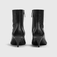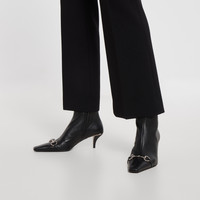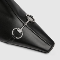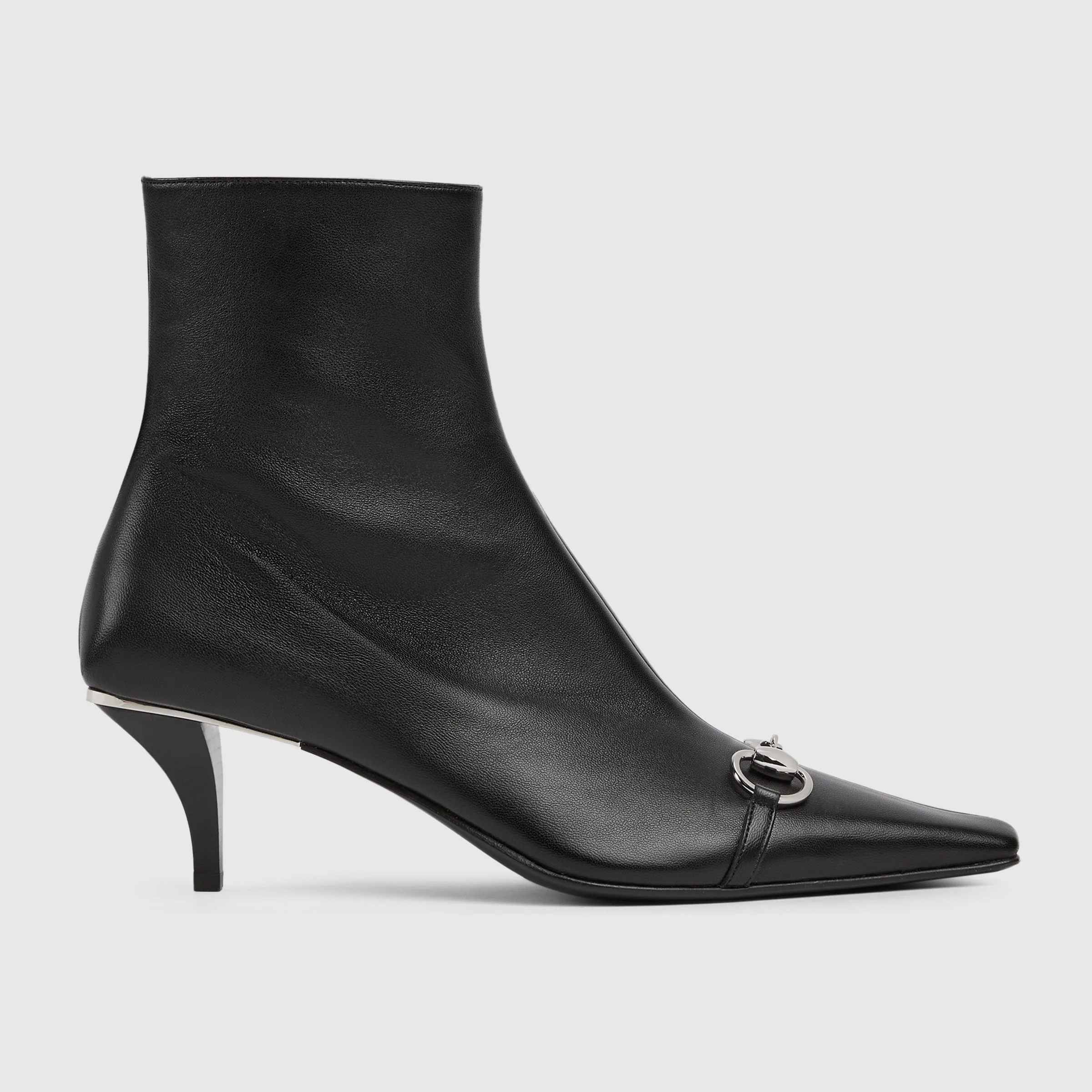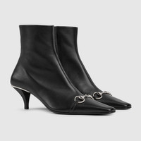 Introducing Spring Summer 2026. Vittoria introduces a bootie silhouette, highlighting a sleek elongated toe with Horsebit and cone-shaped heel. Crafted from soft leather, it is complete with a full side zip closure for a perfect fit and effortless elegance, which inspires its name. - Black nappa leather - Silver-toned hardware - Beige leather lining - Horsebit and "Made in Italy by Gucci" logo in matching metallic finish - Elongated, slightly square toe - Leather sole - Cone-shaped, leather-covered heel, embellished with metallic plate - Full side zip closure - Mid heel - Height: 2.2"; shaft: 5.5"; circumference: 9.8" - Made in Italy