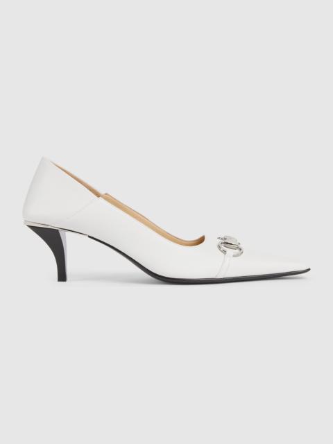 Introducing Spring Summer 2026. This style is featured in "La Flora" and "La Contessa" looks of La Famiglia. Vittoria introduces an extremely flexible silhouette, highlighting a sleek elongated toe with Horsebit and cone-shaped heel. Crafted from soft leather, it can be worn with the back folded down for effortless elegance, which inspires its name. - Black nappa leather - Silver-toned hardware - Beige leather lining - Horsebit and "Made in Italy by Gucci" logo in matching metallic finish - Elongated, slightly square toe - Leather sole - Cone-shaped, leather-covered heel, embellished with metallic plate - Mid heel - Height: 2.2" - Made in Italy