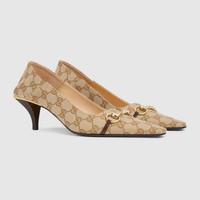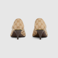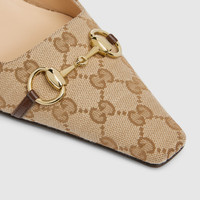 Introducing Spring Summer 2026. Vittoria introduces an extremely flexible silhouette for the La Famiglia collection, highlighting a sleek elongated toe with Horsebit and cone-shaped heel. Crafted from soft leather, it can be worn with the back folded down for effortless elegance, which inspires its name. - Sand and dark brown GG canvas - Leather trim - Gold-toned hardware - Beige leather lining - Horsebit and "Made in Italy by Gucci" logo in matching metallic finish - Elongated, slightly square toe - Leather sole - Cone-shaped heel, covered in leather with metallic plate - Mid heel - Height: 2.2" - Made in Italy