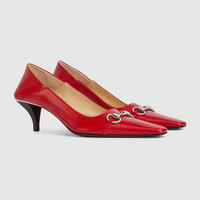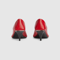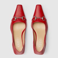 Introducing Spring Summer 2026. Vittoria introduces an extremely flexible silhouette for the La Famiglia collection, highlighting a sleek elongated toe and cone-shaped heel. Crafted from soft leather, it can be worn with the back folded down for effortless elegance, which inspires its name. - Red nappa leather - Silver-toned hardware - Beige leather lining - Horsebit and "Made in Italy by Gucci" logo in matching metallic finish - Elongated, slightly square toe - Leather sole - Cone-shaped, leather-covered heel, embellished with metallic plate - Mid heel - Height: 2.2" - Made in Italy