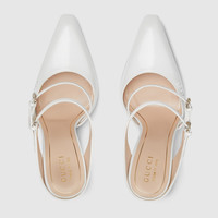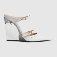 In the Spring Summer 2025 collection, this mule has a wedge heel which is sanded, brushed, and polished by hand for a transparent finish. The style is complete with an embossed logo on the upper, and two adjustable straps with rounded buckle closure. - White shiny leather - Women's - Light gold-toned hardware - Leather lining - Gucci logo on the upper - Elongated toe - Leather sole - Wedge heel with Gucci metal tag inside - Leather strap closure with adjustable buckle - 4.3" heel - Made in Italy