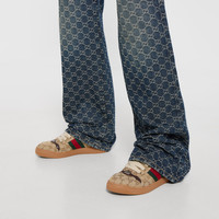 Introducing Spring Summer 2026. The Screener sneaker, which takes its name from a sports move, continues to blend unexpected material and color combinations. Crafted from GG canvas, this style has been treated to achieve a worn-out appearance for the La Famiglia collection. - Sand GG canvas, with worn-out effect created by hand - Dark brown trim - Leather lining - Oval enameled detail with metal Double G - Label with Gucci vintage logo - Rubber sole - Lace-up closure - Flat - Made in Italy